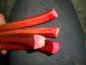 Rhabarbersorte ist rotstielig und rotfleischig, der Saft