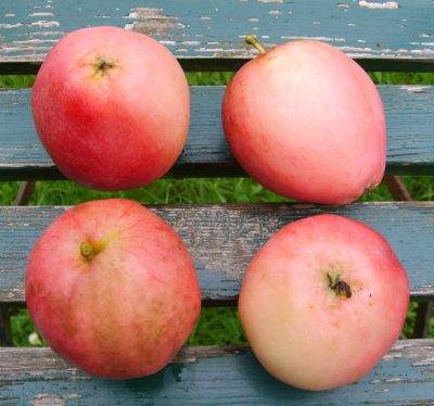 Prinzenapfel, Pommersche Langsüßer, Süßapfel. Frucht: Hervorragender Tafel- u. Wirtschaftsapfel! Aufgebaute, leicht zugespitzte Frucht, änlich Prinzenapfel, mittelgroß. Schale: Glatt, zur Vollreife leicht fettig. Zur Pflückreife rosa-rot-bräunlich (schweinchenrosa) gefärbt, typisch für diese Sorte! Fleisch: Weißlich-gelb, feinzellig-saftig und mittelfest, mit einem ausgezeichneten Fruchtzuckerverhältnis. Diese Sorte beansprucht ausreichend Bodenfeuchtigkeit, aber keine Staunässe! Robuste Liebhabersorte mit dankbaren Erträgen, pflegeleicht.